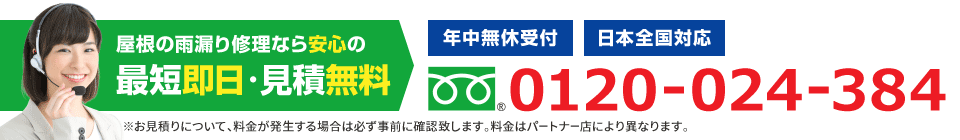 など、雨漏りのお困りごとなら年中無休のフリーダイヤル通話料無料で受付しております。